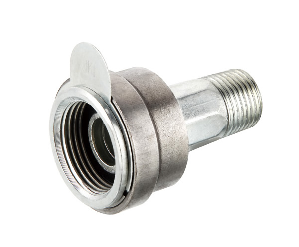 碳钢防盗燃气表接头结构,属于连接类阀门的技术领域,包括活接和连接螺母,活接前端外壁设有外螺纹,活接后端外壁上套设有密封垫圈,且活接带有密封垫圈的后端部伸入至连接螺母内并与连接螺母进行活动卡接,所述连接螺母的外壁外侧罩设有带钥匙的防盗套,防盗套的壁体上开设有螺纹通孔,螺纹通孔内配合设置有锁紧螺钉,与螺纹通孔位置相对应的防盗套外壁上设置有上端开口的罩体,与螺纹通孔位置相对应的连接螺母的外壁上设置有一圈卡槽,锁紧螺钉的螺杆下端向下延伸至卡槽内,锁紧螺钉的头部位于罩体内,且锁紧螺钉的头部与开设在钥匙下端面上的凹槽相匹配。