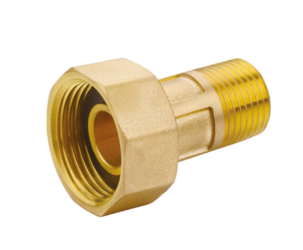 黄铜燃气表接头结构,属于连接类阀门的技术领域,包括活接和连接螺母,活接前端外壁设有外螺纹,活接后端外壁上套设有密封垫圈,且活接带有密封垫圈的后端部伸入至连接螺母内并与连接螺母进行活动卡接,所述连接螺母的外壁外侧罩设有带钥匙的防盗套,防盗套的壁体上开设有螺纹通孔,螺纹通孔内配合设置有锁紧螺钉,与螺纹通孔位置相对应的防盗套外壁上设置有上端开口的罩体,与螺纹通孔位置相对应的连接螺母的外壁上设置有一圈卡槽,锁紧螺钉的螺杆下端向下延伸至卡槽内,锁紧螺钉的头部位于罩体内,且锁紧螺钉的头部与开设在钥匙下端面上的凹槽相匹配。